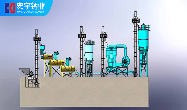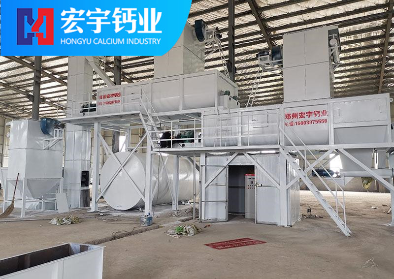 將合格的氧化鈣(CaO)塊料由鄂式破碎機(jī)破碎至40mm左右粒度,經(jīng)斗式提升機(jī)送入氧化鈣儲(chǔ)存罐料倉(cāng),料倉(cāng)中的氧化鈣經(jīng)穩(wěn)流輸送機(jī)定量穩(wěn)重系統(tǒng)進(jìn)入氫氧化鈣Ⅰ級(jí)消化器進(jìn)行初步消化,當(dāng)氫氧化鈣完成初級(jí)消化以后進(jìn)入Ⅱ級(jí)消化或Ⅲ級(jí)消化器,使氧化鈣消化分解,生成合格的氫氧化鈣初級(jí)產(chǎn)品,消化率達(dá)到98%,(消化系統(tǒng)根據(jù)產(chǎn)能要求,機(jī)型設(shè)計(jì)分為單軸、雙軸及多軸機(jī)型)。消化分解好的氫氧化鈣再由半成品螺旋輸送機(jī)送入選粉機(jī)內(nèi),由選粉機(jī)完成產(chǎn)品雜質(zhì)分離和細(xì)度分級(jí),完成分級(jí)后的終端合格產(chǎn)品,由成品輸送機(jī)、提升機(jī)卸入成品氫氧化鈣罐倉(cāng)進(jìn)行分別包裝。本套生產(chǎn)線所有污染節(jié)點(diǎn)由脈沖除塵器完成,收塵率達(dá)到99.5%。